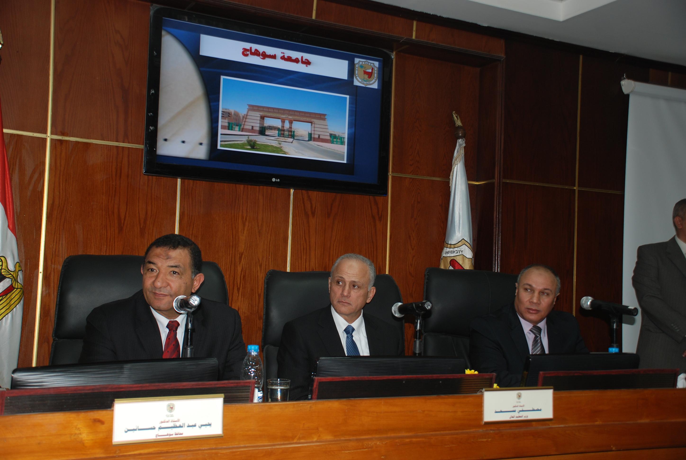 في أولى جولاته لجامعات الصعيد قام الدكتور مصطفى مسعد وزير التعليم العالي، بزيارة إلى مقر جامعة سوهاج الجديدة بمدينة سوهاج الجديدة بالكوامل، حيث كان في استقباله كل من : الدكتور يحيى عبد العظيم محافظ سوهاج ، والدكتور نبيل نور الدين رئيس الجامعة .بدأ الوزير زيارته بافتتاح المباني الجديدة لكل من : كلية التربية والهندسة بالمقر الجديد للجامعة بتكلفة ما يقرب من 105 مليون جنيهاً، ووحدة الغسيل الكلوي والمبتسرين بالمستشفى الجامعي بسوهاج.وأشار وزير التعليم العالي، إلي أن جامعة سوهاج الجديدة تدعو إلى الإعزاز والفخر لأبناء سوهاج، وأوضح أن هذه الزيارة لم تكن بهدف افتتاح المنشآت الجديدة فقط ، ولكن هدفها الرئيس هو التواصل مع جامعات الصعيد وتعميق الصلة ، كما أكد علي أن الجامعة هي قاطرة التنمية والمنقذ الوحيد للخروج بالوطن من مشاكله، حيث أن الشعب المصري أصبح على وعي تام بأهمية العلم والتعليم في خدمة المجتمع .