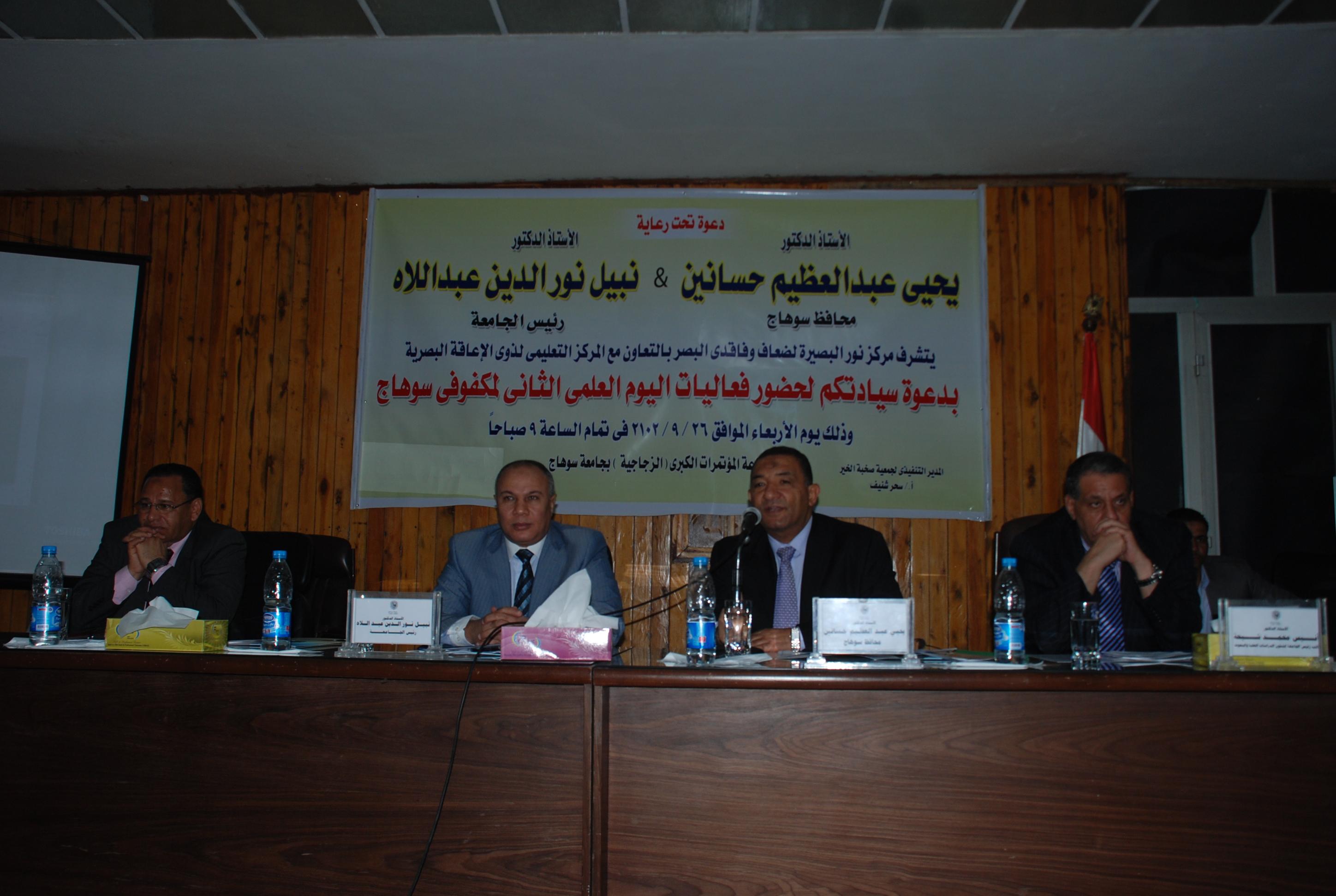 أقيمت صباح اليوم وبرعاية كل من الدكتور/ يحيى عبد العظيم محافظ سوهاج والدكتور نبيل نور الدين رئيس جامعة سوهاج فعاليات اليوم العلمى الثاني لمكفوفى سوهاج بقاعة المؤتمرات الكبرى بالديوان العام، حيث أشار السيد المحافظ فى كلمته على أهمية الدور الذي تقوم به جمعيات المجتمع المدنى خاصة مؤسسة مصر الخير التي تضطلع بدور عظيم فى خدمة المجتمع بصفة عامة ومتحدى الإعاقة بصفة خاصة حيث أثمرت جهودها عن إنشاء المركز التعليمي لذوى الإعاقة البصرية، كما أعرب عن شكره العميق لجامعة سوهاج على مجهوداتها الوفيرة فى خدمة أبناء المحافظة والتى من بينها إنشاء مركز نور البصيرة لضعاف وفاقدى السمع مؤكدا على أن المحافظة تعمل جاهدة بالتعاون مع الجامعة من أجل تنمية وتطوير محافظة سوهاج ومشددا على أن تنمية سوهاج لن تكون إلا بجهود أبناءها وخاصة ممن هم بالجامعات حيث أن الجامعة هى الأساس فى أي تقدم.