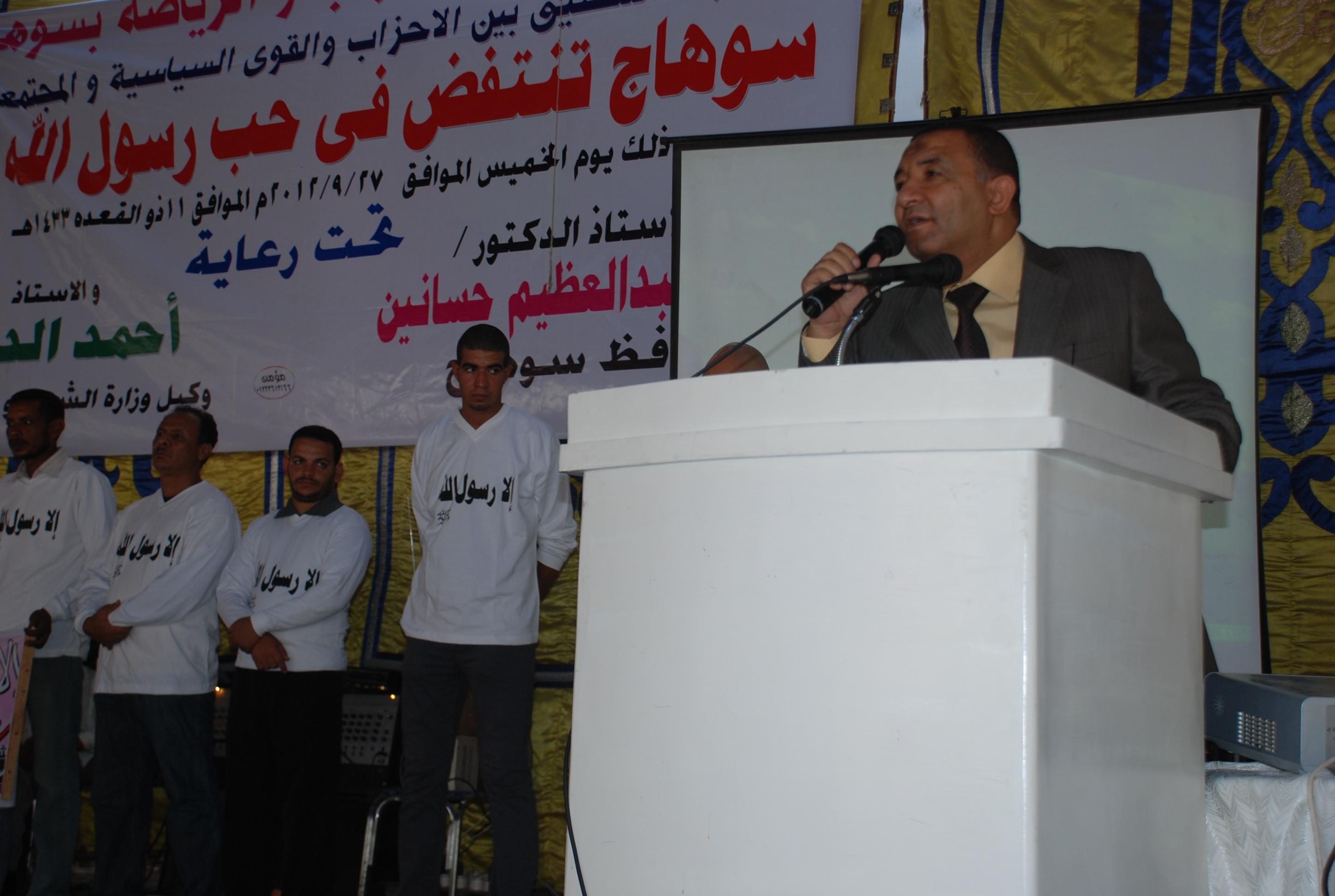 جاء ذلك خلال كلمته فى فعاليات يوم "سوهاج تنتفض فى حب رسول الله" والذي نظمته مديرية الشباب والرياضة بالتعاون مع لجنة تنسيق الأحزاب والقوى السياسية والمجتمعية بحضور العديد من القوى التنفيذية والشعبية بالمحافظة.