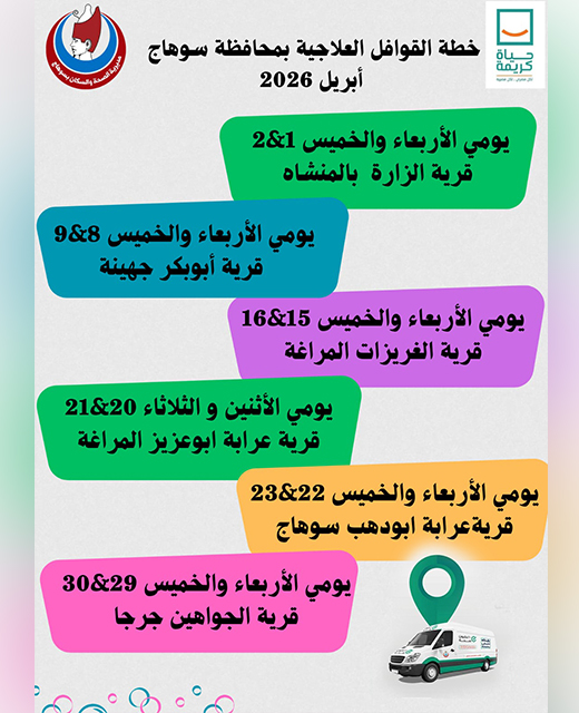 في إطار تنفيذ توجيهات القيادة السياسية، وبرعاية اللواء طارق راشد محافظ سوهاج، وضمن المبادرة الرئاسية لتطوير الريف المصري "حياة كريمة"، أعلنت مديرية الصحة بسوهاج عن إطلاق خطة القوافل الطبية العلاجية المجانية لشهر أبريل 2026، والتي تستهدف تقديم خدمات صحية متكاملة لعدد من القرى الأكثر احتياجًا بمختلف مراكز المحافظة.